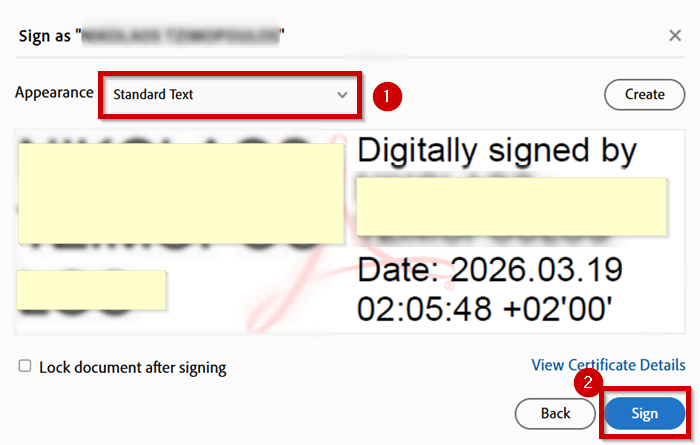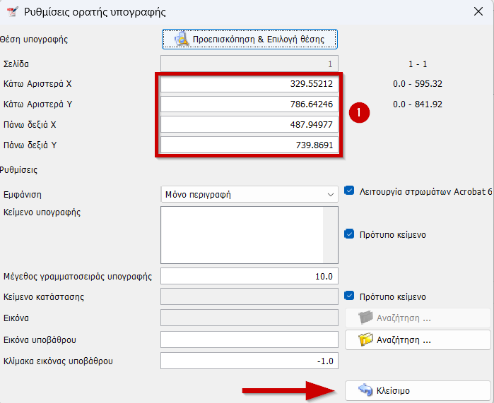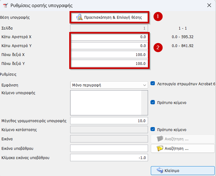 Μετά από την επιλογή θέσης θα ενημερωθούν οι συντεταγμένες της θέσης της υπογραφής (2).