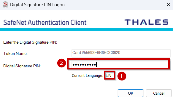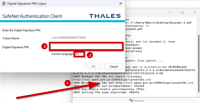Εμφανίζεται άμεσα και παράθυρο με τη τρέχουσα γλώσσα Current Language (2). Εφόσον το Digital Signature PIN που σας έχει δοθεί είναι στην αγγλική γλώσσα φροντίζετε να επιλέξετε στο πληκτρολόγιό σας την Αγγλική γλώσσα και θα εμφανισθεί EN αντί για EL (2).