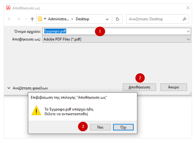Τίθεται το θέμα της αποθήκευσης του εγγράφου. Το λογισμικό προτείνει το ίδιο όνομα του αρχείου που είχατε ανοίξει. Μπορείτε να αλλάξετε όνομα. Αν αφήσετε το ίδιο όνομα εμφανίζεται μήνυμα επιβεβαίωσης για την αντικατάσταση του εγγράφου. Επιλέγετε Ναι εφόσον συμφωνείτε.