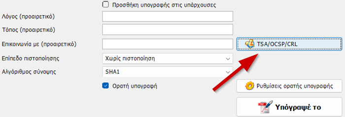 Προκειμένου να εισαχθεί η ασφαλής χρονοσήμανση (δηλαδή η λήψη ημερομηνίας και ώρας από έναν ασφαλή εξυπηρετητή και όχι από το ρολόι του συγκεκριμένου υπολογιστή) θα πρέπει να εισαχθούν μερικές παράμετροι στην εφαρμογή. Πιο συγκριμένα επιλέγετε το κουμπί TSA/OCSP/CRL.