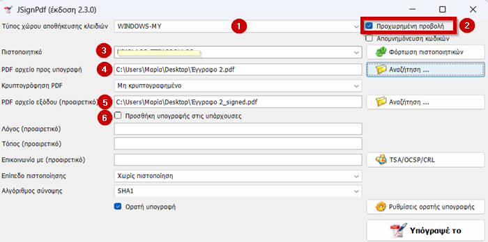5. Η εφαρμογή εμφανίζει ως όνομα αρχείου το όνομα του αρχείου που έχετε επιλέξει συνοδευόμενο από το: _signed. Μπορείτε να αλλάξετε το όνομα αρχείου.