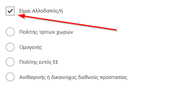 Εάν δεν έχετε ελληνική ιθαγένεια, τσεκάρετε το πλαίσιο «Είμαι Αλλοδαπός/ή».