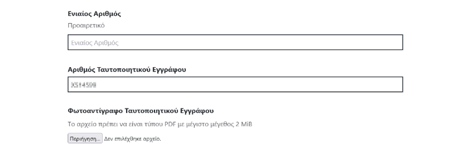 Στη συνέχεια θα πρέπει να δηλώσετε τον αριθμό του ταυτοποιητικού εγγράφου για παράδειγμα τον αριθμό της αστυνομικής ταυτότητας ή του διαβατηρίου και να επισυνάψετε φωτοτυπία του.