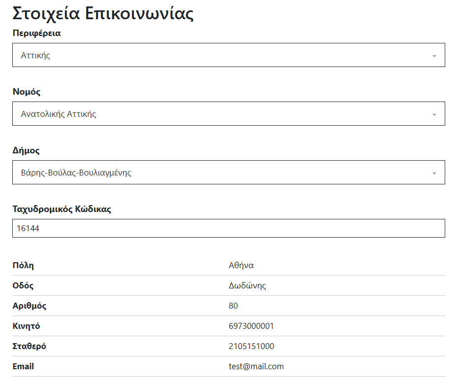 Στα στοιχεία επικοινωνίας καλείστε να επιλέξετε από τις αντίστοιχες αναδυόμενες λίστες την περιφέρεια, τον Νομό, τον Δήμο και να εισάγετε τον Ταχυδρομικό κώδικα πληκτρολογώντας στο πεδίο.