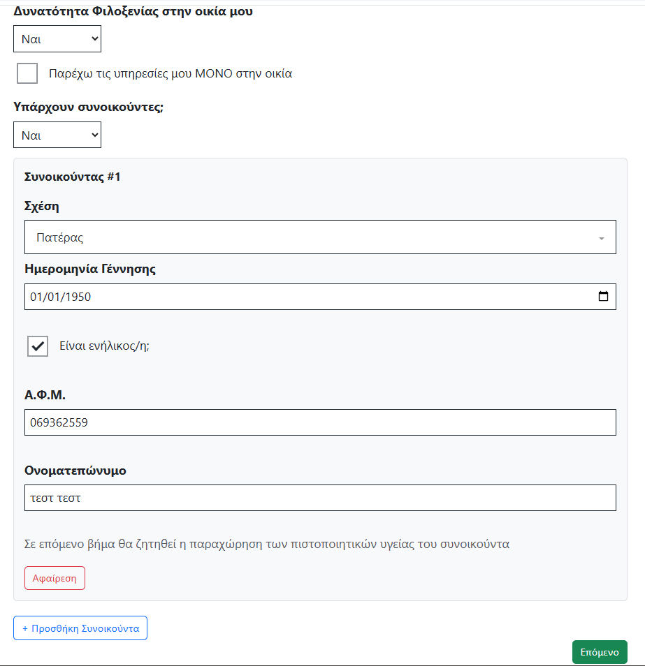 Στο πλαίσιο "Υπάρχουν συνοικούντες;" επιλέξτε «Ναι» ή «Όχι». Εάν επιλέξετε "Ναι", εμφανίζεται η φόρμα καταχώρισης των στοιχείων κάθε συνοικούντα.