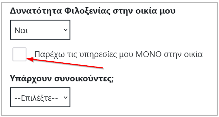 Αν επιλέξετε ΝΑΙ στη δυνατότητα φιλοξενίας στην οικία σας, θα πρέπει να τσεκάρετε ή όχι το κουτάκι "Παρέχω τις υπηρεσίες μου ΜΟΝΟ στην κατοικία μου"